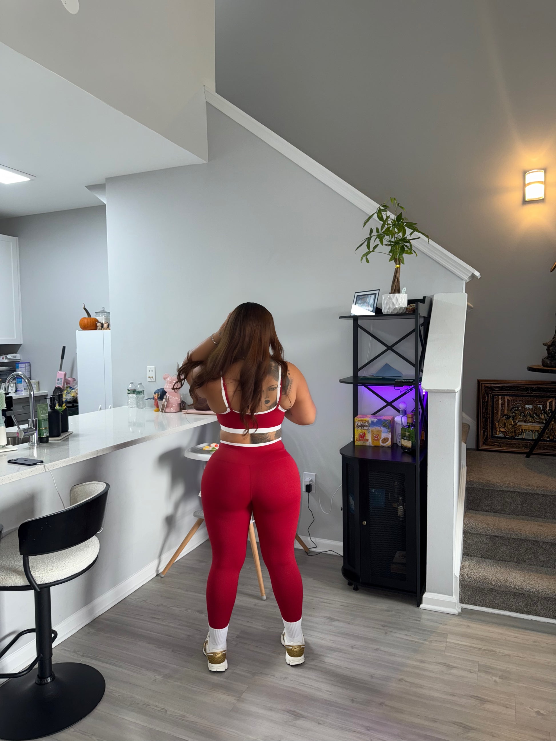 A two toned set perfect for working out, yoga, Pilates or just an ever day fit. Super stretchy body hugging material non see through. The top has a built in bra with removal padding. WASH WITH COLD WATER THE RED DOES TINT OUT. Model wearing size medium 5’0 for reference.
